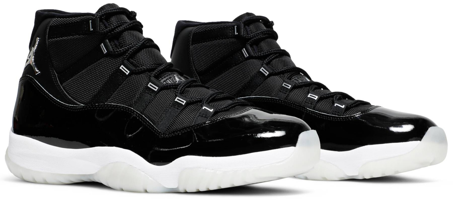 The Air 11 Retro 閳?5th Anniversary閳?celebrates the classic silhouette閳ユ獨 quarter-century birthday with a monochrome black finish throughout the upper . constructed from a traditional blend of ballistic mesh and patent leather. In keeping with the shoe閳ユ獨 silver anniversary . a 3D metallic Jumpman and matching 閳?3閳?branding decorate the heel . while 閳ユǚ鈧?is spelled out in stylized silver lettering on each of the sneaker閳ユ獨 eyelets. The mid-top rides on a classic white foam midsole . supported by a translucent rubber outsole.