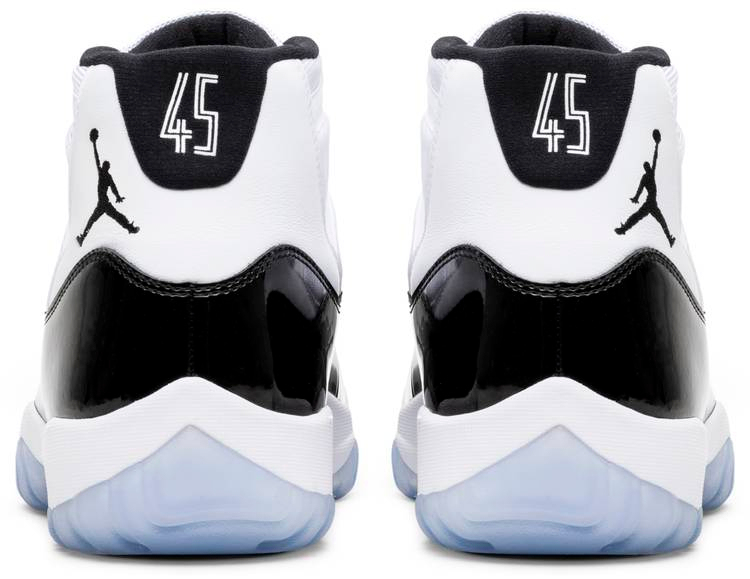 The 2018 edition of the Air 11 Retro 閳ユゥoncord閳?features 閳?5閳?stamped on the black heel tab閳ユ攣 nod to the jersey number that Michael wore upon his return to basketball following his first retirement. The rest of the build keeps the shoe閳ユ獨 signature details intact . including a white ballistic mesh upper . black patent leather overlays and an icy translucent outsole underfoot.