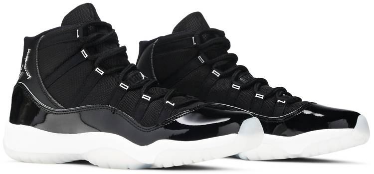 The grade school variant of the Air 11 閳ユクubilee閳?. also known as the Air 11 '25th Anniversary' . celebrates the classic silhouette閳ユ獨 quarter-century birthday with a monochrome black finish throughout the upper . constructed from a traditional blend of ballistic mesh and patent leather. In keeping with the shoe閳ユ獨 silver anniversary . a 3D metallic Jumpman and matching 閳?3閳?branding decorate the heel . while 閳ユǚ鈧?is spelled out in stylized silver lettering on each of the sneaker閳ユ獨 eyelets. The mid-top rides on a classic white foam midsole . supported by a translucent rubber outsole.
