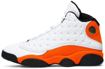 The Air 13 Retro 閳ユソtarfish閳?features a familiar color palette that recalls the 閳ユソhattered Backboard閳?editions of the Air 1. The upper combines a white tumbled leather base with orange suede paneling and signature dimpled overlays in white leather. Traditional branding elements include an embroidered Jumpman atop the tongue and the 13's holographic eye on the lateral ankle. A contrasting black finish is applied to the panther-paw outsole.