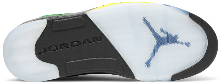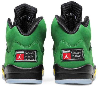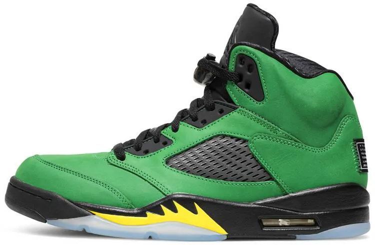 The Air 5 Retro SE 閳ユサregon閳?features a distinctive color scheme paying tribute to the Oregon Ducks. Like the university閳ユ獨 PE edition . the shoe uses a green suede upper accented with a Team woven tag on the heel and contrasting black hits on the eyelets . tongue and quarter panel netting. The mid-top rides on a black foam midsole . accented with yellow shark tooth detailing and reinforced with a translucent rubber outsole.