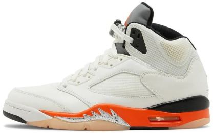 The Air 5 Retro 閳ユソhattered Backboard閳?showcases a familiar palette on a reconstituted build. The upper combines traditional white leather construction with textile mesh on the collar . throat and quarter panel . replacing the plastic netting of the original. An embroidered orange Jumpman adorns the reflective matte silver tongue. The mid-top is mounted on an orange polyurethane midsole . fitted with a visible Air-sole unit in the heel and accented with silver shark tooth detailing. Underfoot . a milky translucent outsole features a herringbone tread for optimal grip.