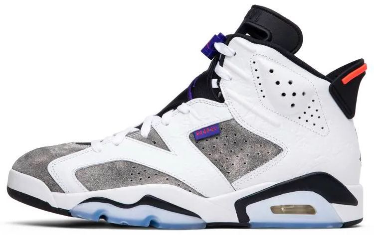 Released in January 2019 . the Air 6 Retro LTR 閳ユォlint閳?revives a popular color scheme previously used on the Air 7. The build features a grey suede base with white leather overlays . accented with discreet pops of Dark Concord and Infrared. A white and black midsole . complete with an encapsulated Air Sole unit . gives way to an icy translucent rubber outsole.