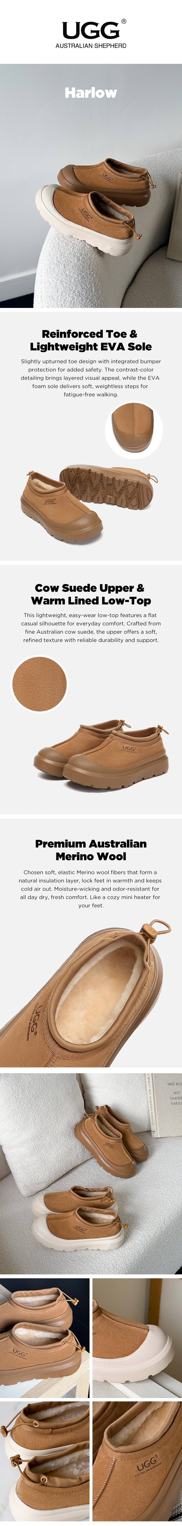 Experience practicality and cosy comfort all in one with the Australian Shepherd Drawstring Harlow UGG slippers. Made with durable cow suede and fully lined with soft Australian sheepskin wool, these slippers offer all-day breathability and warmth. The modern two-tone design and sporty wraparound sole edge add a fresh touch to a classic look. Available in Chestnut and Beige White, they’re perfect for both women and men and make a great gift for loved ones.