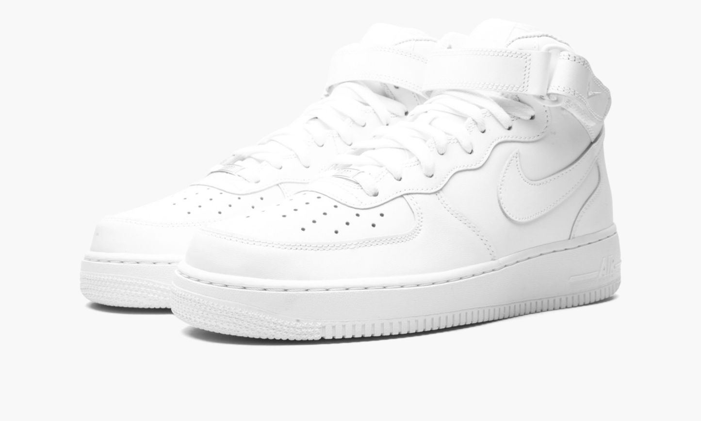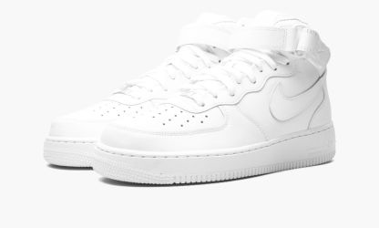 White leather/rubber 1 Mid ’07 sneakers from featuring signature Swoosh logo detail, round toe, perforated detailing, front lace-up fastening, ankle touch-strap fastening, branded insole and rubber sole. These styles are supplied by a premium sneaker marketplace. Stocking only the most sought-after footwear, they source and curate some of the most hard to find sneakers from around the world..